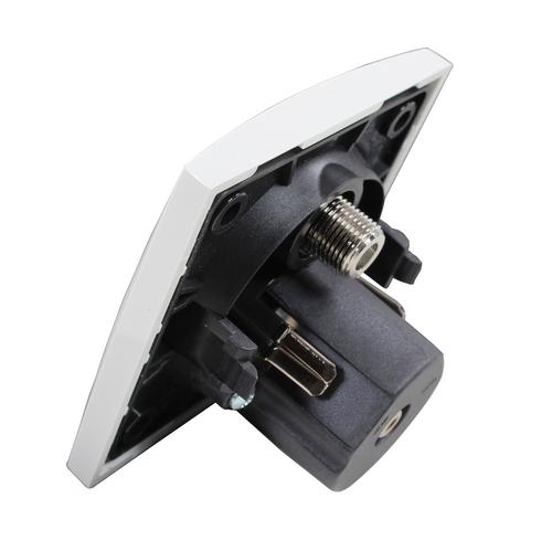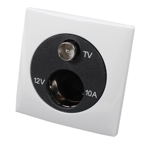 Pistoke tupakansytyttimellä ja TV-liittimellä, valkoisella kehysmateriaalilla. 12V DC, maksimi 10A. Litteä pistoke. Liitostyyppi: IEC uros. Liitäntä: F-liitin. Asennussyvyys ilman kaapeliliitäntää: 28 mm.