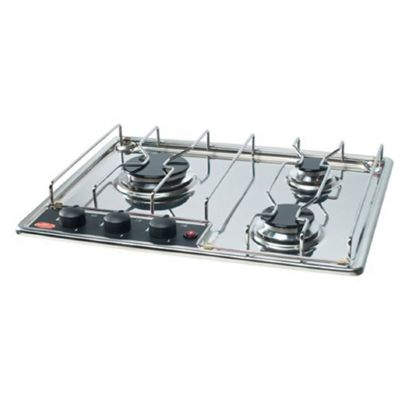 Upotettava/sisäänrakennettava kolmen polttimen liesi on valmistettu ruostumattomasta teräksestä. Suuri ruoanvalmistuskapasiteetti kätevässä koossa. Soveltuu erinomaisesti moottoriveneisiin ja katamaraaneihin. Malliin ei ole saatavissa kattilan pidikkeitä. Paketin mukana ei tule kaasujohdon liitintä.