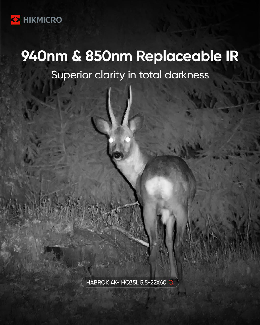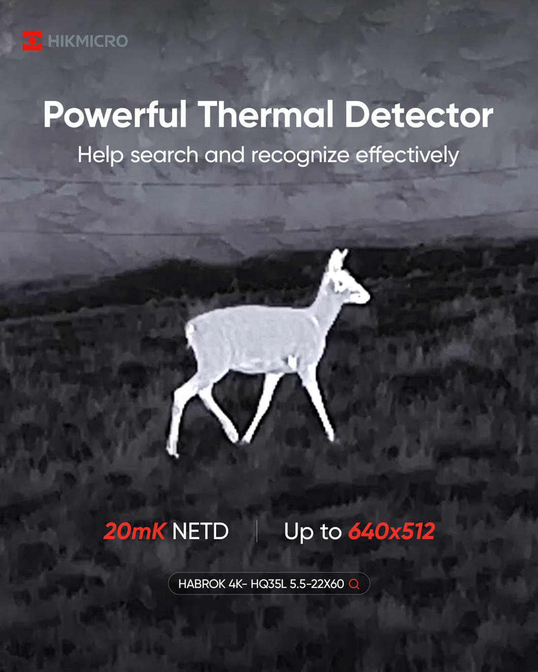Habrok HQ35L on suorituskykyinen 4K-monitaajuuskiikari, jossa on poikkeuksellisen tehokas 640×512 lämpöanturi alle 20 mK:n herkkyydellä ja 35 mm:n linssi lämpöjälkien havaitsemiseen jopa 1800 metrin etäisyydeltä. Se yhdistää tämän 4K CMOS-digitaaliseen sensoriin ja 60 mm:n optiikkaan, joka takaa upeat yksityiskohdat ja jopa 22-kertaisen suurennoksen. Sisäänrakennetun 1000 metrin laseretäisyysmittarin, parannettujen kuva-algoritmien ja taitettavien silmäkuppien ansiosta se tarjoaa poikkeuksellista tarkkuutta ja mukavuutta. Se on kestävä, IP67-luokiteltu ja ergonominen, vain 798 g painava, ja se toimii jopa 8 tuntia vaihdettavilla 18650-paristoilla tai ulkoisella virtalähteellä. Käyttäjä voi valita 850 nm:n tai 940 nm:n IR-vaihtoehdon.