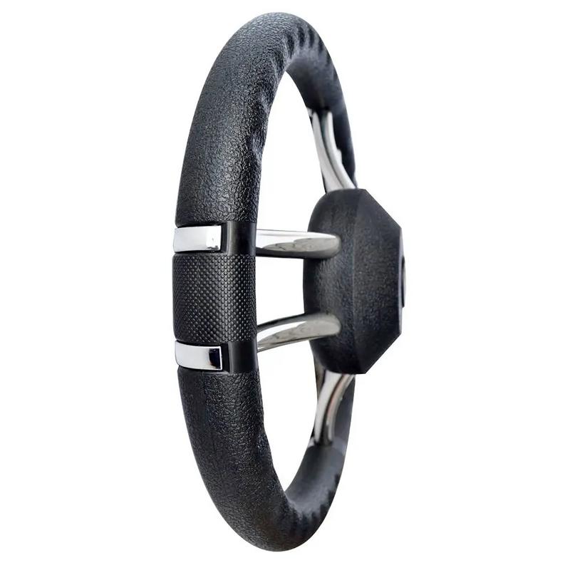 Italialaisen Savoretti Armandon laadukas ohjauspyörä on valmistettu ruostumattomasta teräksestä ja siinä on musta polyuretaanista valmistettu ohjausrengas erityisen hyvän pidon takaamiseksi. Ohjauspyörän halkaisija on 35 cm ja siinä on 6 kpl 16 mm:n kaarevia ruostumattomasta teräksestä valmistettuja puoloja. Ohjauspyörän napa on PU-päällystettyä alumiinia ja napakapseli/suojus keinonahkaa luomaan ylellisempää tuntumaa.