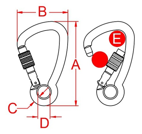 Ruostumaton teräskarbiinikoukku suoralla kiinnikkeellä ja sivuaukolla.