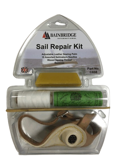 Veneen purjeen korjaamiseen tarkoitettu korjaussarja.