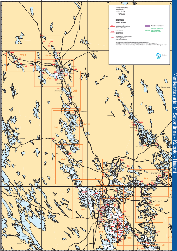 J Vesijärvi–Päijänne 1:40 000 K Keitele ja Keiteleen kanava 1:40 000 L Lappeenranta–Savonlinna 1:40 000 M Savonlinna–Kuopio 1:40 000 N Tampere–Virrat 1:30 000 O Tampere–Hämeenlinna 1:30 000 P Valkeakoski–Längelmäki–Hauho 1:30 000 R Pielisjoki 1:20 000 S Saimaan kanava 1:10 000 T Oulujärvi 1:40 000 V Savonlinna–Joensuu 1:40 000